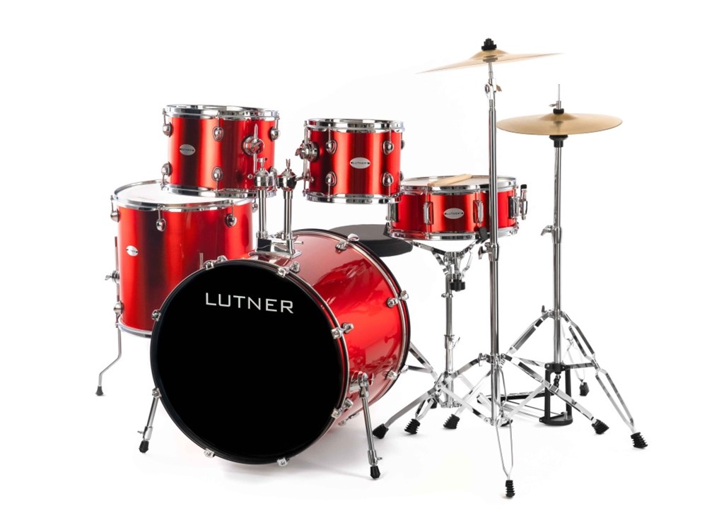 Литые ободы Прозрачные пластики с даемпфирующим кольцом по центру Пластик на рабочем барабане матовый Комплектация: прямая стойка - 1шт стойка хай-хет - 1шт стул барабанщика, диаметр трубы 22-25мм - 1шт Хай-хэт 14" Крэш 16" Барабаны - 10",12",14",16",22" цвет красный.