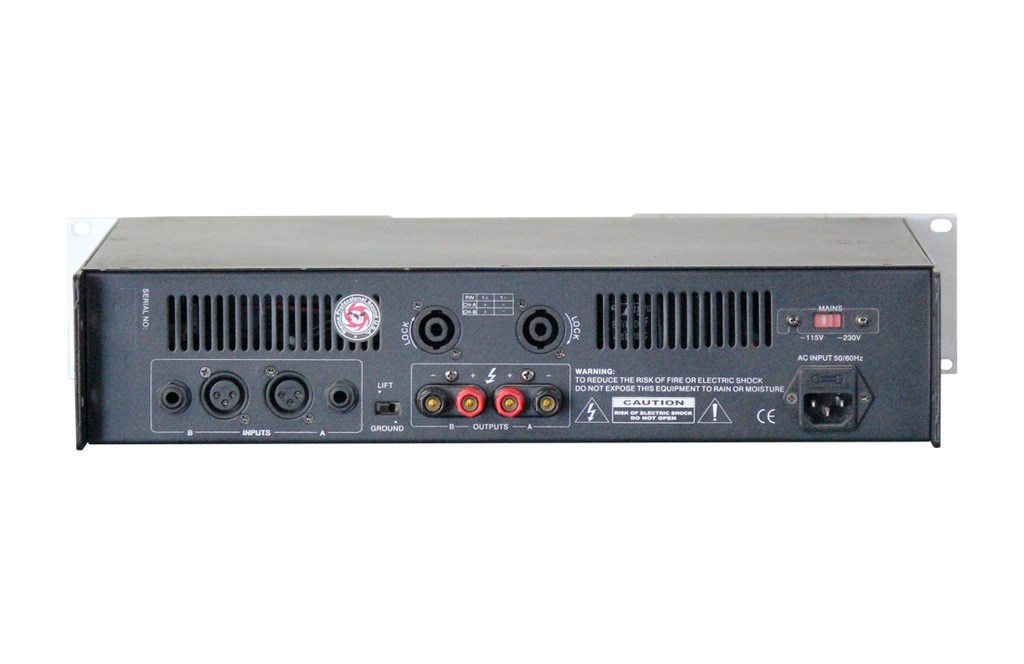 Контроллеры задней панели: переключатель режима Stereo/Bridge/Parallel. Разъемы: XLR балансный вход, 6.35мм балансный вход, выход Speakon, выходные винтовые клеммы. Потребляемая энергия, половинная 8Ohm: Питание: AC 220-240В/50Гц.