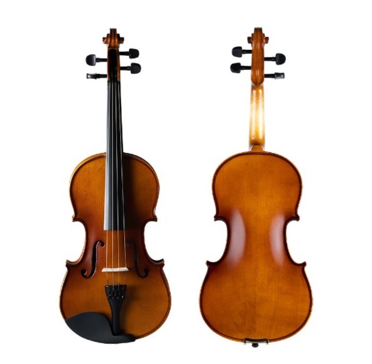 Верхняя дека скрипки изготовлена из резонансной ели, легкой и прочной древесины, высушенной в течении нескольких лет. Для задней деки и обечайки используется из жесткой древесины клена. Машинки на каждой струне облегчают игру начинающим скрипачам.