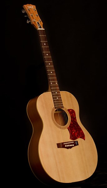 Форма корпуса: джамбо. Верхняя дека: массив ели. Задняя дека и обечайки: отделка шпоном красного дерева.