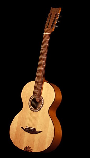 Задняя дека и обечайки: массив клена, инкрустация красным деревом и орехом. Гриф: клен, вставка: палисандр. Накладка грифа: палисандр.