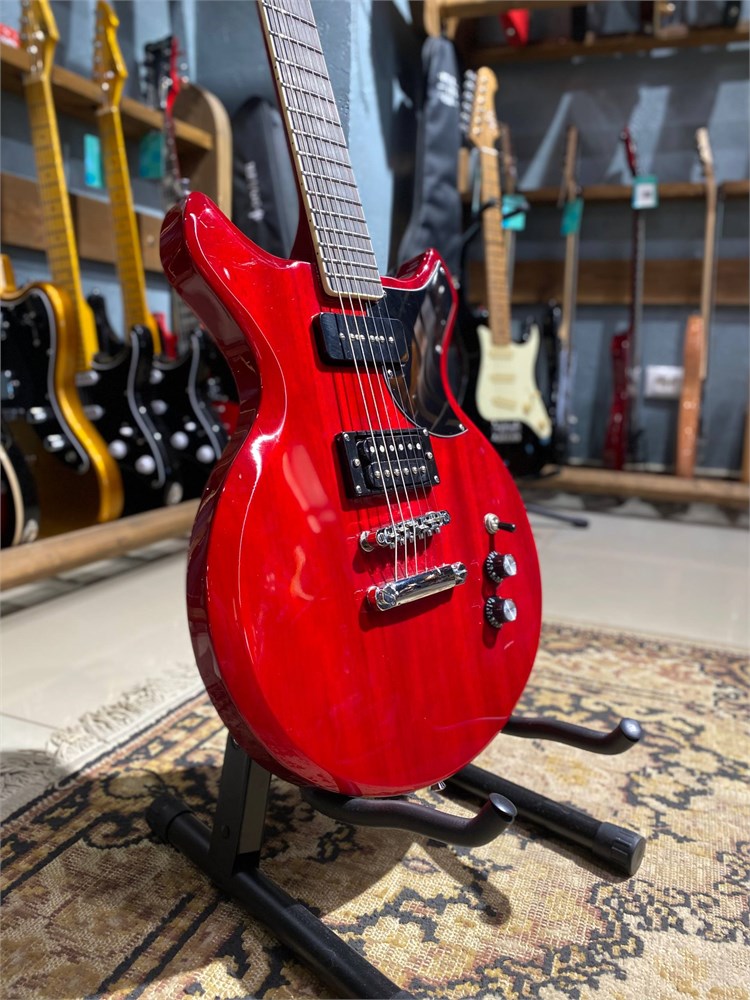 Используются струны D’Addario. Особенности Шестиструнная электрогитара из серии Silveray Корпус типа Les Paul Цельный корпус из красного дерева 22 лада Вклеенный гриф из красного дерева с накладкой из чёрного дерева, глянцевая отделка грифа 1 x хамбакер с двойной катушкой + 1 х звукосниматель P90 Трехпозиционный тумблер переключатель звукоснимателей Отделка – Transparent cherry ABS-пикгард в чёрном цвете Характеристики Электрогитара, серия Silveray, модель DC, в цельном корпусе из красного дерева с двумя вырезами.