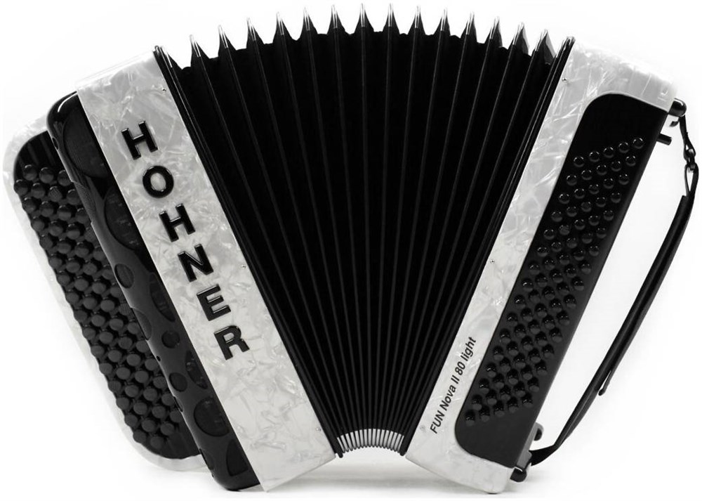 HOHNER Fun Nova II 80 Iight (A7001) white perloid celluloid это инструмент размера 3/4, двухголосный, с раскладкой клавиатуры в B. В комплект входят: ремни, чехол.